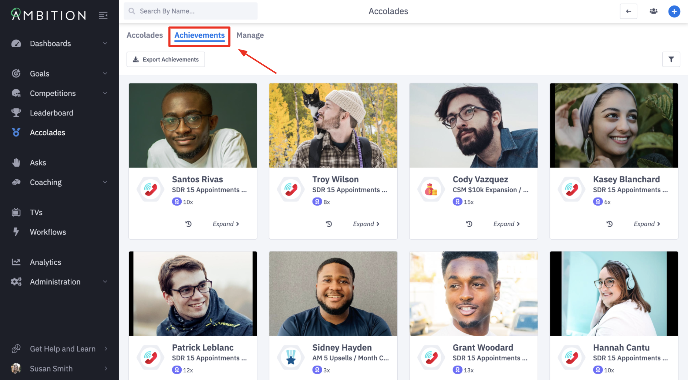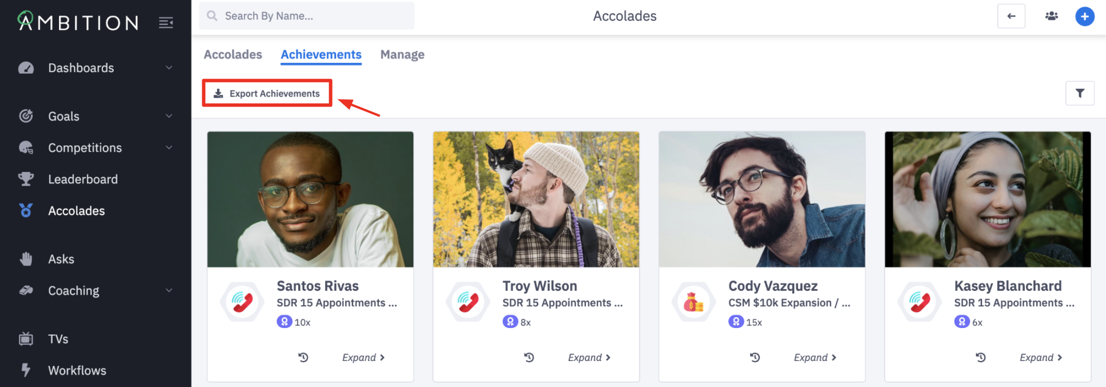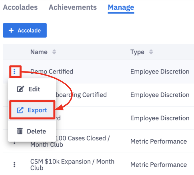 Users with "Can Create Accolades for anyone" permission can export achievements for all accolades within the manage tab.