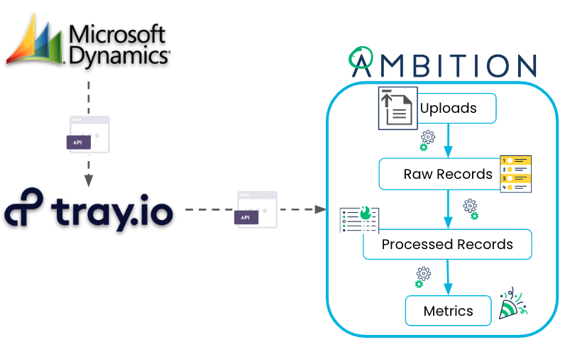 Ambition will build a custom integration by leveraging Tray.io’s data connector API services between your Dynamics instance and Ambition.